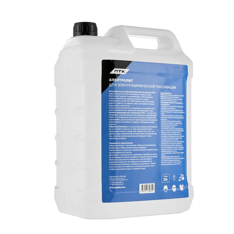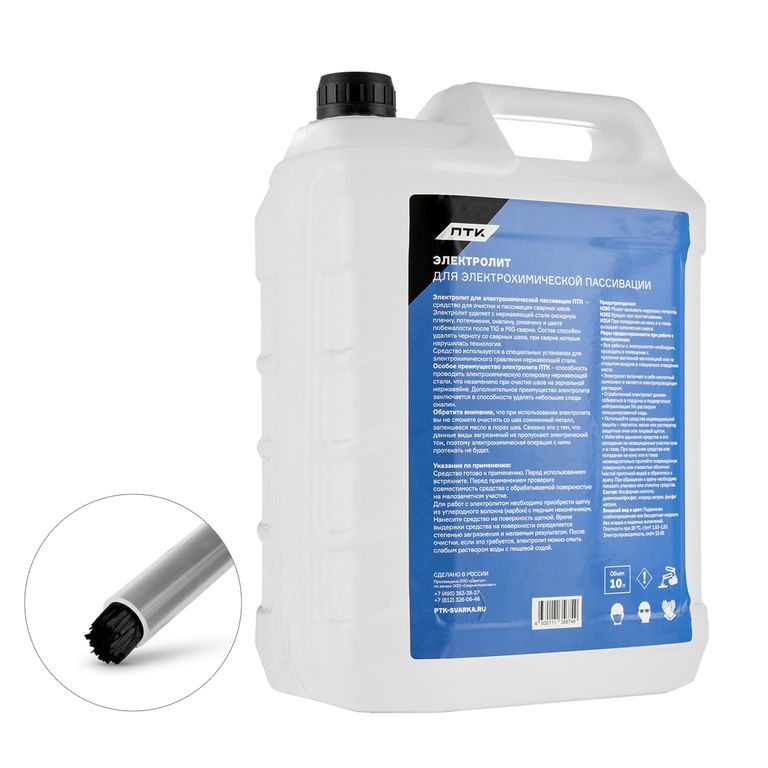 Электролит для электрохимической пассивации ПТК – средство для очистки и пассивации сварных швов. Электролит удаляет с нержавеющей стали оксидную пленку, потемнения, окалину, ржавчину и цвета побежалости после TIG и MIG сварки. Состав способен проводить электрохимическую полировку нержавеющей стали, что незаменимо при очистке швов на зеркальной нержавейке.